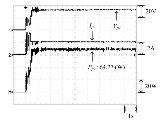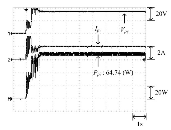 Figure 18 illustrates the P–V characteristic curve of Case 4. The curve exhibits two peaks, and the global maximum power point is located on the right peak (64.84 W). Figure 19 and Figure 20 illustrate the results obtained through the conventional and modified PSO algorithms, respectively. Observing these two figures showed that the conventional PSO algorithm not only required additional time to transcend regional solutions but was also affected by the noise signals on the P–V curve. Therefore, the solution oscillated near 60 W before determining the global maximum power point. By contrast, the modified PSO algorithm enabled quick transcending of regional solutions, and the tracking and interpretation process was less affected by the noise signals.