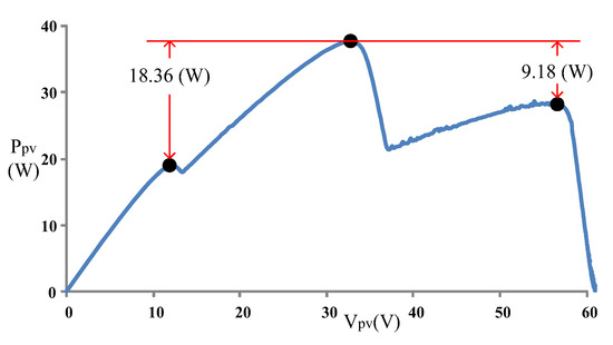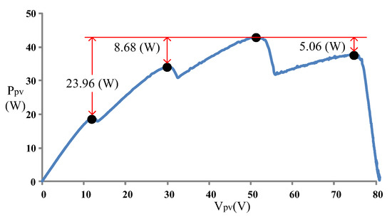 The test results verified that for each case, the modified PSO algorithm attained more favorable tracking speed and accuracy than did the convention PSO algorithm. Furthermore, using the conventional PSO algorithm failed to track the global maximum power point in Case 3. Therefore, the P–V characteristic curves of Case 2 and Case 3 were further analyzed (Figure 21 and Figure 22). The results showed that in Case 2, the global maximum power point differed from the left and right regional solutions by 18.36 W and 9.18 W, respectively. In Case 3, the global maximum power point differed from the three regional solutions by 23.96 W, 8.68 W, and 5.06 W (from the leftmost to rightmost peaks, respectively). Although both cases exhibited multiple-peak curves, two of the regional solutions in Case 3 closely approximated the global maximum power point. This facilitated incorrect identification of regional solutions as the global solution. Accordingly, the conventional PSO algorithm performed least desirably in Case 3.