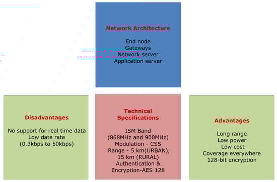 Along with the above-mentioned issues, urban-surveillance is much affected by the resources consumed by the participating entities of the network. The excess utilization of resources, such as energy, increases the operational cost of the network and decreases the lifetime of the system. Such a situation raises issues related to the failure, and lack of survivability and reliability of nodes during continuous network operations. Use of application-specific frameworks and software-oriented networks can help minimizing the wastage of resources through intelligent decision modeling [27,28,29,30]. However, these solutions can resolve issues at application level only and strategies are required for problem resolution at the system level. A solution that can consume lower energy and provide wide connectivity can resolve this issue. One such possibility can be the use of Low-Power Wide Area Networks (LPWAN) [31,32,33]. Networks operating with sensors or battery operated devices can take advantage of LPWAN module as it uses low-bit rate communication but to a large extent. This helps in transmitting information for longer duration and without much wastage of energy resources. While using IoT devices on LPWAN, LoRaWAN is developed as a protocol specifically for handling low-energy consuming transmissions [34,35]. LoRaWAN uses a novel ideology of network for bi-directional communication, mobility-management and localization services for IoT devices [36]. It provides a novel architecture for LPWAN implementation for long-range communications. It is capable of operating for a network over an ISM band (868 MHz and 900 MHz) and in the range of 5–15 km at data rates between 0.3 kbps and 50 kbps [37]. The bandwidth is specified separately for urban and rural scenarios as well as for the countries of operations. An overview of LoRaWAN specifications, its advantages, and disadvantages are presented in Figure 1 [38,39].