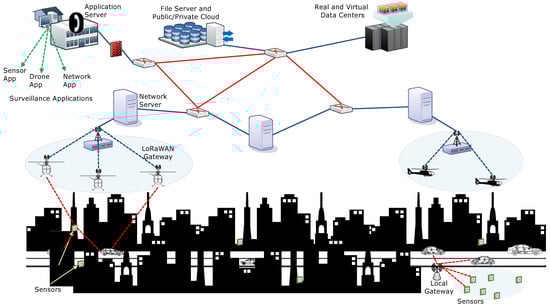 Nowadays, urban surveillance in ITS has reached altogether to an incipient height by utilizing drones as a key component [11,12]. These drones are either flown by a human operator or autonomously for information accumulating through onboard sensors and mounted devices. Another major advantage of utilizing drones is their capability for on-demand data acquisition, processing, and transmission through Network Function Virtualization (NFV) and Software-Defined Networking (SDN) [13]. Apart from these, modern day networking has withal highlighted the utility of drones for the full-time availability of connectivity. Drone networking and its issues have been a key highlight for many researchers across the globe and different strategies have been proposed for their full functional deployment in the next generation of wireless networks or data acquisition over the sensor fields [13,14,15]. It is undoubted that drones can enhance the scalability of surveillance, but there are certain challenges that are to be tackled for their utilization, which includes issues cognate to path planning, deployment, task allocation, location identification, coverage and capacity modeling, trajectory optimization, flight time improvement, secure-transmissions, cyber-physical connectivity, reliable computing and cooperative network formations [16,17,18,19,20,21,22,23,24,25,26]. Solutions to these problems are a must while deploying drones in ITS for urban surveillance.