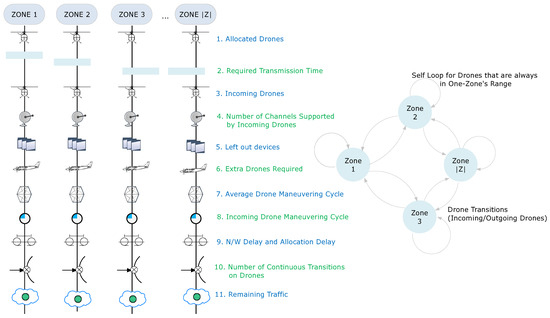 This setup can be formulated into the number of steps required for predicting the state of the network after a required time. These states are marked as transitions between the zones into which the sensors are deployed. Such an overview of predicting network state via drone modeling and traffic conditions is presented in Figure 3 (This same model can be extended for any type of ground entity, be it the LoRaWAN switches, end-users or even other drones). The details of network state prediction are as follows: