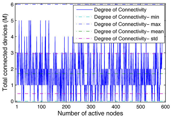 This model can be extended for probability of connectivity , which can be defined as a function of network load. This load is dependent on the arrival rate of incoming packets. For this, that can be modeled for , which is the required rate for the network, and , which is the minimum rate that can prevent congestion. From these, can be given similar to Equation (8), such that, , s.t., . Now, considering that is the actual time for which the network should be operational to support realistic data transmissions between the end users via LoRaWAN architecture, the probability of failure before this time, is calculated as [65]: