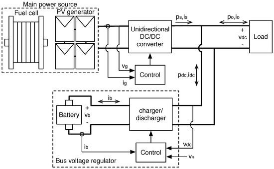 Another important application in which batteries are extensively used is the construction of stand-alone renewable power systems, which are common solutions for remote energy generation and urban/distributed energy systems for pollution reduction [13,14]. A common structure of such power systems based on renewable generators and batteries is presented in Figure 1 [15,16,17,18,19,20,21,22]. Such an architecture has a renewable energy source as the main energy generator, e.g., photovoltaic modules or fuel cell, interacting with a unidirectional DC/DC converter that is responsible for optimizing the source operating conditions. The output of the DC/DC converter is connected to a DC bus that is regulated by a charger/discharger power converter, which also interfaces the battery with the DC bus. The charger/discharger converter is controlled to regulate the DC bus voltage within safe limits and simultaneously impose a given energy flow between the battery and the DC bus. Due to safety implications for the source and load, there are many research papers focused on regulating the DC bus voltage using charger/discharger converters: some of them are based on linear control [16,23,24,25,26], others are based on intelligent control [13,27,28,29,30,31,32], and others are based on non-linear control strategies [15,17,18,19,20,21,22].