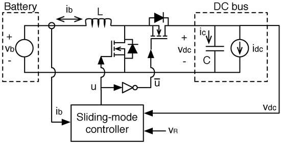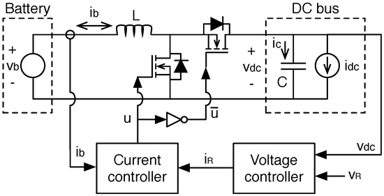 A widely used battery charger/discharger DC/DC converter is presented in Figure 2, which is based on a bidirectional boost (buck) converter [38]. Moreover, this figure also illustrates a classical cascade current-voltage control structure, in which the current controller acts on the MOSFET signal u directly (e.g., sliding-mode, peak current, valley current controllers) or using a PWM (e.g., average current control). This structure is used to avoid the non-minimum phase condition exhibited by the transfer function between the DC bus voltage and the converter duty cycle. This is achieved by controlling the inductor current, i.e., the battery current, which exhibits a minimum phase transfer function with respect to the duty cycle. Then, the inductor is modeled as a current source to provide a minimum-phase first-order transfer function between the DC bus voltage and the current reference; hence, a linear controller can be used to regulate the bus voltage. However, this strategy requires a narrow bandwidth in the voltage loop to ensure the validity of the current source approximation. This is the main drawback of the cascade structure: the bandwidth of the voltage controller is between 5 and 10 times smaller than the current loop [39,40,41]. Hence, the controller speed is constrained, which reduces its ability to compensate fast perturbations.
