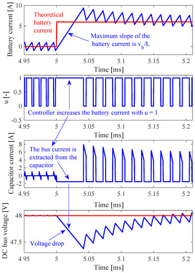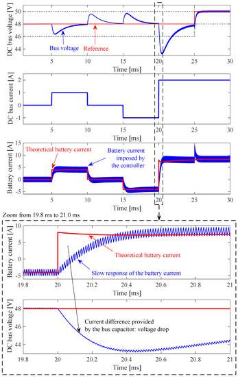 The magnified area of the simulation (from 19.8 ms to 21.0 ms) also reveals the reason for the large voltage deviation caused by current transients: the change in the bus current must be compensated by the battery current, which due to power balance corresponds to a theoretical battery current of . However, as observed in the magnified region of the figure, the battery current imposed by the controller is considerably slower than the theoretical battery current; hence, the current difference must be provided by the bus capacitor, producing a voltage drop. This behavior is unavoidable in the structure of Figure 3 because, as observed in the magnified region of Figure 4, the battery current is defined by the error between the bus voltage and the reference. Therefore, the battery current changes only when a deviation in the bus voltage occurs.