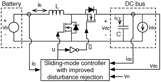 With the aim of improving the current disturbance rejection for the charger/discharger, the control structure proposed in Figure 5 considers the measurement of the bus current. Moreover, the controller must be designed to take advantage of this new information. In addition, since the charger/discharger must be controlled in both positive and negative power flows by the same controller and because the bandwidth of the system must be set as high as possible, i.e., no linearization processes involved, the proposed controller is based on sliding-mode theory.