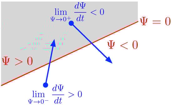 However, the sign of the derivative of depends on the transversality sign: implies that a positive value of u () causes a positive change in . Similarly, implies that causes a negative change in . Therefore, since this work has imposed a positive sign of the transversality in (16), the following conditions must be fulfilled to ensure the reachability of the surface: