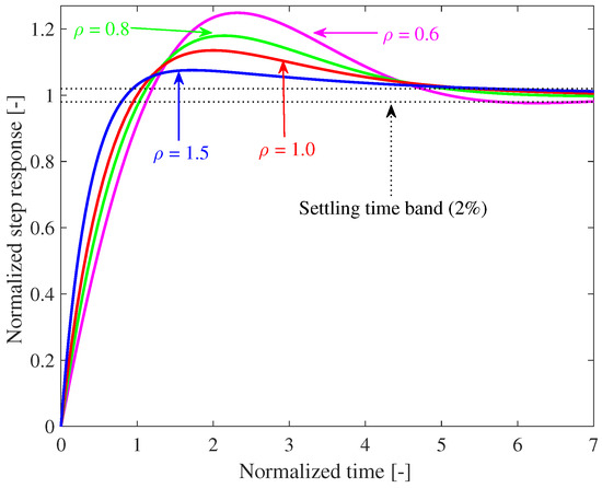 Note that (47) does not depend on the specific value of ; rather, it depends on the relation m between and . To illustrate this condition, several values of (and the associated values of ) were used to simulate the step response (43) for a specific value of m. The adopted value of was obtained by solving Equation (47) for a maximum overshoot 5%. Then, four values for rad/s were tested, calculating the values of rad/s using Equation (42). The simulation results are presented in Figure 8, where it is verified that the time response of exhibits a maximum overshoot 5% for all the conditions tested, which confirms the correctness of (47). Moreover, Figure 8 also shows that it is possible to design the settling time of using the value of ; the procedure is presented in the next subsection.