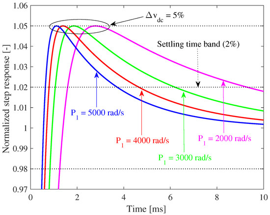 The results presented in Figure 7 are valid for any natural frequency; hence, it is a general analysis. Finally, in the following subsections, the two real poles are designed to impose a given maximum overshoot and settling time, both defined by the load requirements.