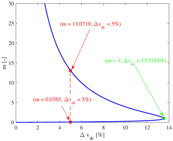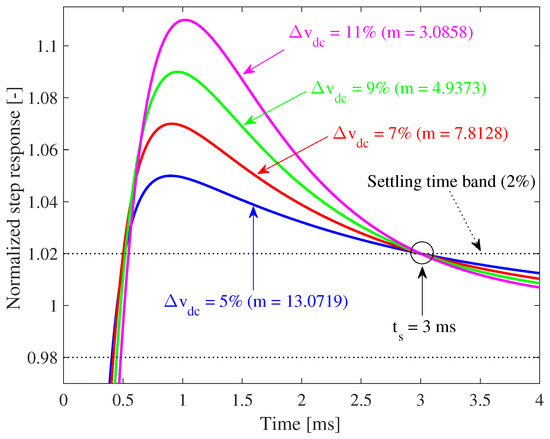 The solution of (44) is reported in (45). Then, the condition for imposing a given maximum overshoot is reported in (46): the value of the bus voltage described by (43) at must be equal to . Substituting (43) into (46) leads to (47), which is a non-linear equation that enables calculating the value of m required to impose the desired maximum overshoot . This equation must be solved using numerical methods, e.g., by using fsolve from MATLAB.