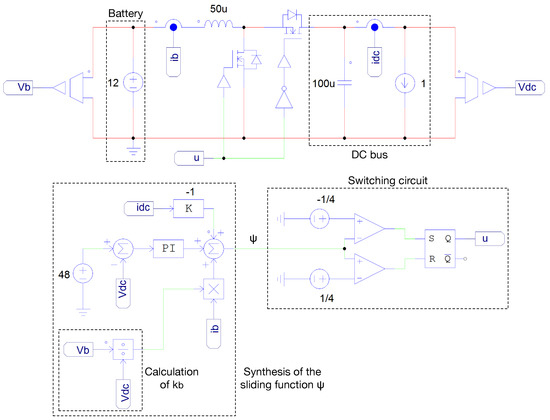 The SMC designed in [15] is based on the sliding function and sliding surface presented in (1) and (2), respectively. In these expressions, represents the battery current, which is equal to the inductor current as observed in Figure 2 and Figure 3; represents the DC bus voltage; and represents the desired bus voltage, i.e., the reference value. Moreover, and are parameters designed to impose a desired dynamic response on the DC bus voltage.