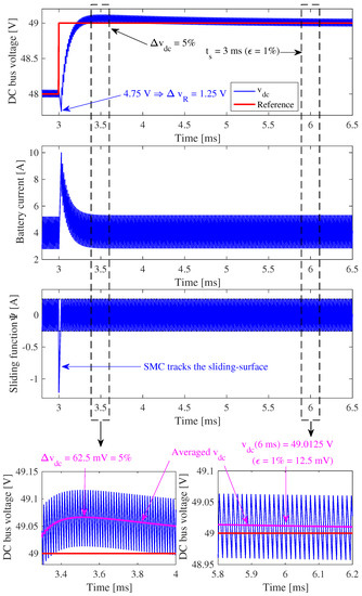 Figure 15 shows the simulation of the proposed sliding-mode controller with a step change of 1 V in the reference value. This simulation shows that the controller forces a fast change in the battery current to accelerate the bus voltage response. However, as described in Section 5.3, this action requires during the time in which the battery current is increased, forcing the bus capacitor to provide the bus current, which produces a small voltage drop V. Therefore, the effective reference change faced by the controller is V; this means that the maximum overshoot must be V mV, and the band % corresponds to V mV. The magnified plots at the bottom of Figure 15 confirm the correct behavior of the controller, where the maximum overshoot and settling time are measured with the average signal of to remove the switching ripple.