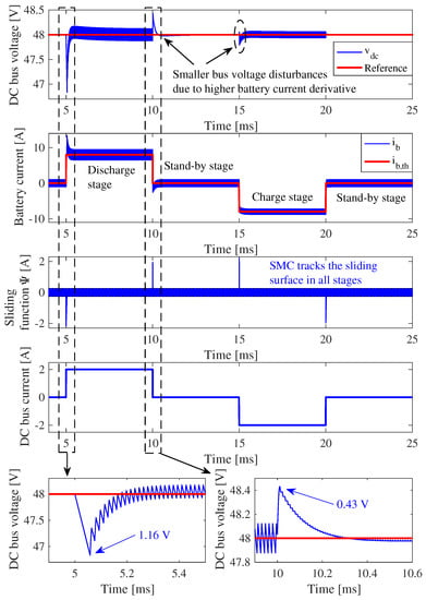 Figure 16 presents the simulation of the proposed SMC with perturbations in the DC bus current for all the operating conditions: stand-by stage ( A), charge stage ( A) and discharge stage ( A). The simulation considers step perturbations in the bus current with a magnitude equal to 2 A, which is 100% higher than the magnitude of the perturbations used to test the controller reported in [15]. The simulation results demonstrate the satisfactory performance of the controller in compensating the bus current perturbations. Similarly, the simulation shows a fast and accurate tracking of the sliding surface in all the operating conditions. Note that the perturbations produce different deviations in the bus voltage: in the discharge stage, the battery current increases with the slope () and decreases with the slope (), which has a higher magnitude. Therefore, the transition from stand by to discharge is slower than the transition from discharge to stand by; hence, a larger voltage deviation occurs in the former transition. This comparison is presented in the magnified region at the bottom of Figure 16.