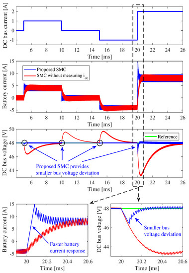 This improved disturbance rejection is due to the faster battery current response provided by the proposed SMC. Such a condition is observed in the magnified region at the bottom of Figure 17, where the battery current imposed by the proposed SMC increases faster to compensate the bus current in a shorter time. This behavior results in a lower current extraction from the bus capacitor to provide a lower voltage deviation of the bus voltage.