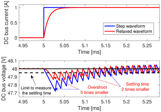 The other performance criterion commonly used to specify the behavior of a DC bus corresponds to the settling of the voltage after perturbations. The value of is selected from the time that the load is able to operate in a condition different from the nominal voltage.