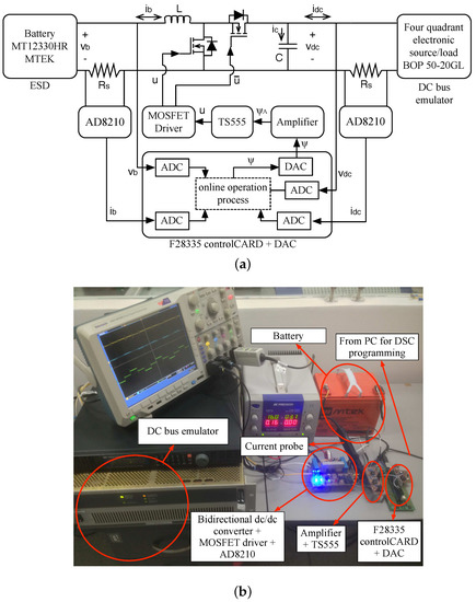 To provide an experimental proof-of-concept, the battery charger/discharger and the proposed SMC were implemented as reported in Figure 19. In particular, Figure 19a shows the schematic diagram of the experimental platform. The prototype consists of a MT12330HR sealed lead-acid battery from MTEK [50], a BOP 50-20GL four-quadrant source/load from Kepco [51] to emulate the DC bus, the bidirectional power converter reported in Figure 5, and digital and analog circuits implementing the sliding-mode controller.