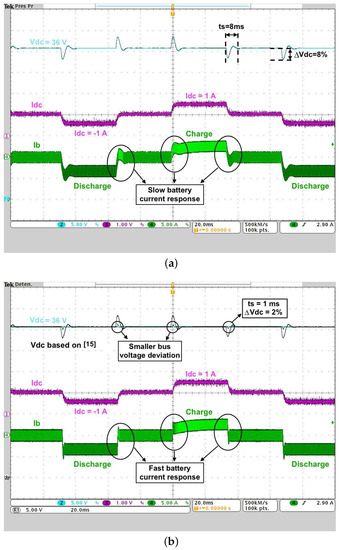 To reproduce the simulations reported in Figure 17, the experimental perturbations in the DC bus current have a magnitude of 1 A in the three operating conditions: charge, discharge and stand by. Figure 20a shows the slow change in the battery current imposed by the SMC reported in [15]; in contrast, Figure 20b shows the fast change in the battery current imposed by the proposed SMC. This behavior enables the proposed SMC to provide a tighter voltage regulation. Moreover, the experiments consider a relaxed current waveform, hence the voltage overshoot and settling time must be smaller than the maximum limits imposed for the design process: 5% and 3 ms, respectively. In fact, the experimental voltage waveform reported in Figure 20b exhibits an overshoot near to 2% and a settling time near to 1 ms. Finally, both Figure 20a,b validate the analysis and simulations presented in the previous section and, simultaneously, demonstrate the correctness and implementation viability of the proposed solution.
