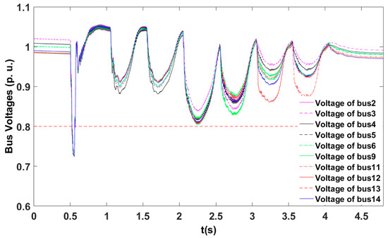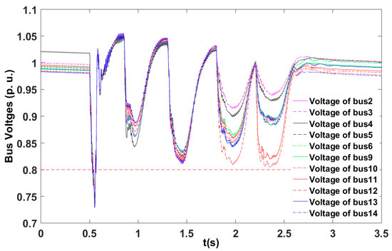 The obtained load restoration strategy is as follows: . The restoration is divided into 4 stages, and the details of each restoration stage are shown in Table 4. The dynamics of the restored load bus voltages are depicted in Figure 6.