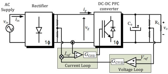 Conventional power supplies usually only have one full-bridge diode rectifier and one large capacitive filter in the input stage. This front-end circuit operates with a high Total Harmonic Distortion (THDi) in the grid current, a low power factor (0.5–0.7) and normally does not meet regulatory standards, such as the important international standard IEC 61000-3-2 []. Among the possible alternatives to improve the performance of switched sources, a highlight is the use of a DC-DC converter to creation a Power Factor Correction (PFC) system. As shown in Figure 1, this solution makes it possible to build nearly ideal rectifiers (emulates a resistor) and still achieve voltage, current or power regulation.