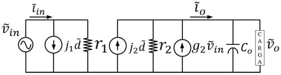 The expressions (12) and (13) represent the model of small low-frequency signals of the SEPIC converter. They are also used to obtain the equivalent small-signal circuit, illustrated in Figure 5. From this equivalent circuit, the desired transfer functions of the SEPIC converter can be obtained. In addition, it should be noted that the equivalent small signal impedance of the load () directly depends on the load to which the PFC converter is connected. In this case, making use of a purely resistive load (), the equivalent small signal impedance shall be considered equal to the load itself, i.e., .