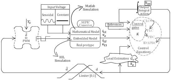Standard control procedure. The control goal is to get the equation for d. With the signal of the duty cycle synthesized, it is necessary to limit it between zero and one, and then, the corresponding PWM (Pulse Width Modulation) signal is produced for input to the converter. Therefore, it is necessary to estimate the value of the load represented by and add an integral action.
