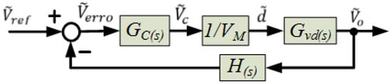 The dynamic properties of the converter are determined from an introduction of an AC small-signal variation on the steady-state operating point, where the small signal values are considered to be much smaller than the quiescent values: , , , and , where “−” indicates the steady-state value and “∼” represents the small-signal disturbance introduced.