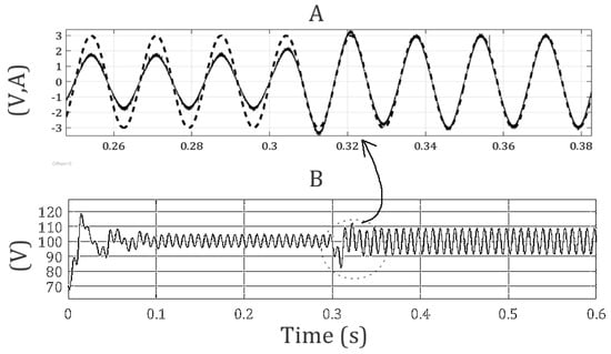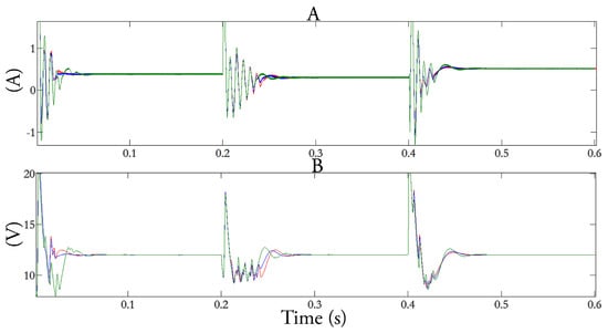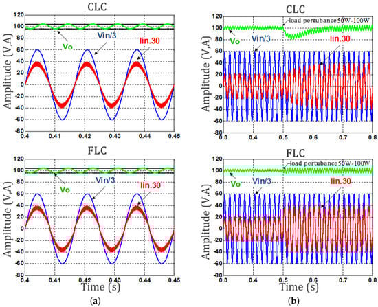 It can be seen from Figure 10b that the dynamic behavior of the SEPIC converter is able to regulate the output voltage in both control strategies, although it takes different times to achieve this regulation, for a load variation of 50 W–100 W. In the case of the linear approach, the SEPIC converter spends approximately 120 ms to perform the voltage regulation, allowing that voltage to decrease by approximately 20 V. On the other hand, the converter has been able to regulate this output voltage in less than one grid cycle in the FLC approach. In addition, in the nonlinear technique, an overvoltage or current signal is not verified in the voltage regulation, surpassing the linear approach in this discussion point.