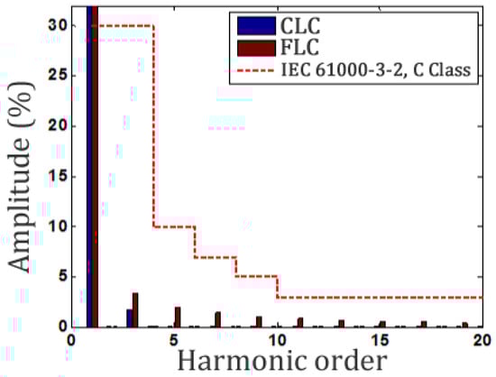 The first analysis considers the operation of the full load converter (100 W), as shown in Figure 10a. In this figure, it is possible to observe the power factor correction characteristic of the SEPIC PFC converter, which has a high power factor (—0.9975, —0.9971), low harmonic content (—6.33%; —7.60%) and is still able to maintain the output voltage at the reference of 100 V within the limits imposed by the design. The low harmonic content of the input current is evidenced in the spectral analysis shown in Figure 11, where it is noted that the values obtained in the two control approaches are far below the limits imposed by the IEC 61000-3-2, Standard Class C.