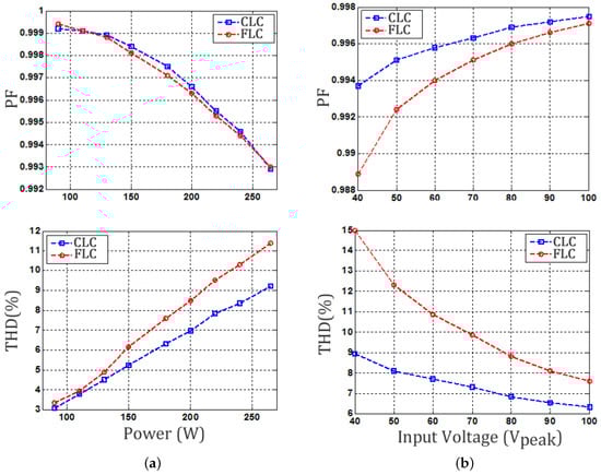 The other analysis is presented in Figure 12b, and again, the converter is able to maintain a high power factor and low harmonic content in both control approaches, now for different load values. In addition, it is observed that there is a more evident superiority of the linear approach in this last analysis to the different values of the load, which can be explained by the distortion in the waveform of the current in the passage through zero due to the presence of a derivative action in the FLC methodology.