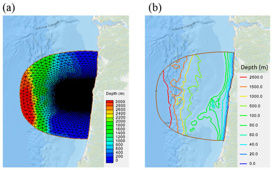 An extended UnSWAN model grid, UnSWAN (L), was generated to support the conduct of additional sensitivity tests of unstructured grid flexibility and wind effect. UnSWAN (L) covers a much larger region with flexible meshes―from approximately 125.6° W to 124° W in the longitudinal direction and from 43.7° N to 45.6° N in the latitudinal direction―to demonstrate the flexibility and efficiency of unstructured grid models. The UnSWAN (L) model grid and the bathymetric features are shown in Figure 2. For the internal region that overlays the UnSWAN model domain (water depth less than 500 m), the grid resolution is very fine and has an average element area of 82,066 m2, which is equivalent to a side length of 435 m for an equilateral triangle. Outside the UnSWAN domain, the grid resolution gradually decreases to about 8000 m toward the open boundary, where the maximum water depth is about 3000 m (Figure 2).
