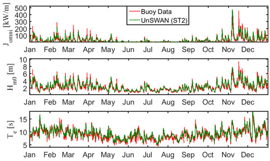 Hourly time-series comparison of three representative International Electrotechnical Commission (IEC) wave resource parameters between UnSWAN (ST2) predictions and observed data over the one-year period of 2009 at NDBC Buoy 46050. The open-boundary condition of UnSWAN is forced with the model output of WWIII, using the ST2 physics package.