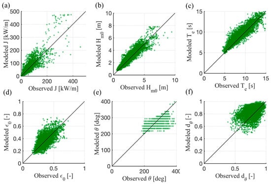 Model performance was also examined using XY scatter plots for all six wave resource parameters in Figure 4. The XY scatter plots show good correlations between simulated and observed omnidirectional wave power, significant wave height, and energy period, similar to the time-series comparisons in Figure 3. Furthermore, simulated omnidirectional wave power and significant wave height exhibit more scattering for large waves (Figure 4a,b), indicating that the model’s function of predicting large waves under extreme events is less accurate than that under the normal sea-state conditions. In addition, the simulated wave energy periods tend to be slightly larger compared to observed data (Figure 4c). Furthermore, the simulated spectral width falls within the range of 0.2 to 0.7; the small value corresponds to a narrow spectral spread in winter, whereas the large value corresponds to a broad spread in summer [22] (Figure 4d). However, correlations for the direction of the maximum directionally resolved wave power and directionality coefficient are not very strong, as shown in Figure 4e,f.