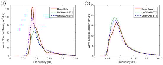 Both WWIII and UnSWAN were used in this study. UnSWAN includes source terms for linear and exponential wind input growth and the formulation for wind input parameterization. Dissipation terms due to whitecapping, depth-induced wave breaking, and quadruplet and triad wave interactions were considered in the simulation. WWIII consists of source terms with different physics package options that consider sea ice and various wind–wave interaction and dissipation effects [6,36,37]. Specifically, the ST2 physics package is based on previously developed wind input and nonlinear interaction source terms and a new dissipation source term consisting of high- and low-frequency constituents [36]. The ST4 physics package consists of new parameterizations for swell, wave breaking, and short-wave dissipations of winds-generated waves, which are consistent under a wide range of conditions and at scales from the global ocean to coastal regions [37]. Both ST2 and ST4 physics packages were evaluated in this study.