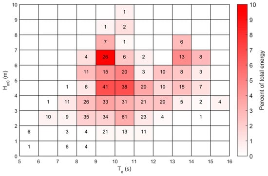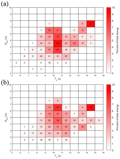 The maximum occurring sea state does not correspond to the sea state with the highest percentage of total energy, because of the contribution from waves with lower significant wave height and energy periods, as shown in Figure 7 and Figure 8. These findings are consistent with Lenee-Bluhm et al. [22]. Red shading is used to differentiate the percent of total energy; dark red color means the greatest contribution to energy. In Figure 7, the maximum percentage of total energy derived from data occurs at Hm0 = (6–7) m and Te = (9–10) s. On the other hand, the maximum percentage of total energy simulated by UnSWAN-ST2 occurs at Hm0 = (4–5) m and Te = (10–11) s, and at Hm0 = (7–8) m and Te = (14–15) s (Figure 8a), while the maximum simulated by UnSWAN-ST4 occurs at Hm0 = (6–7) m and Te = (11–5) s, and at Hm0 = (6–7) and Te = (14–15) (Figure 8b). This is indicative of the ST4 physics package being more skilled at simulating significant wave heights and bivariate distributions of maximum energy.