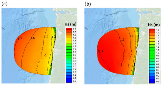 Modeled 2D significant wave height distributions with UnSWAN (L): (a) no wind—November average, 2009; (b) with wind—November average, 2009.