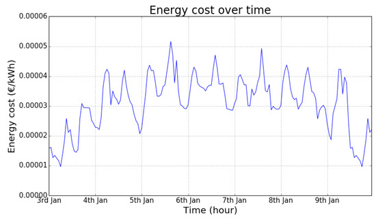 - gross outgo: this is the amount of money spent to buy energy from the power grid:where N is the duration of the simulation (one week: 168 h or time intervals), energyPrice[k] is the energy price at the time interval k and energyBought[k] is the amount of energy bought at the instant k.