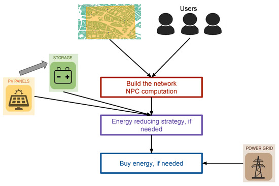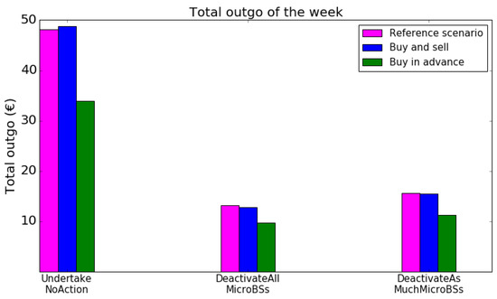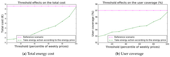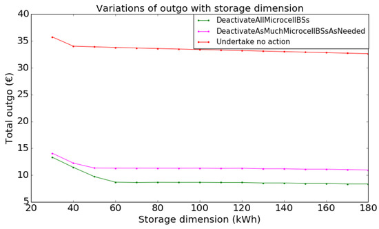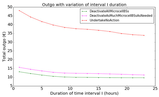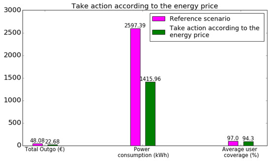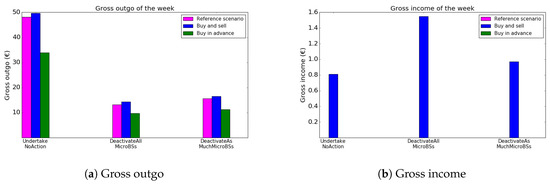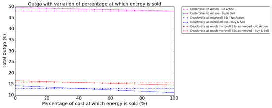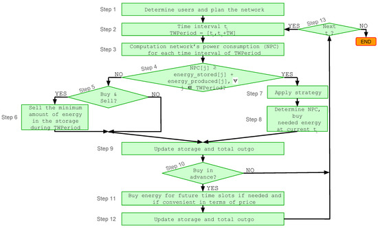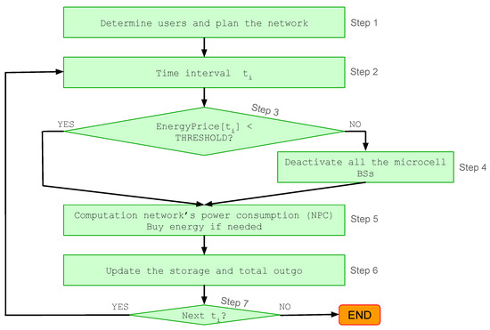 Therefore, the bought amount of energy is taken from the grid at time slot t and stored in the batteries. In case the amount of energy bought during past time slots and allocated for the current one is not sufficient, the necessary amount is purchased from the power grid.The number of time slots over which the algorithm iterates (maximum duration of time interval I) is a parameter that is investigated in this study. Nevertheless, its maximum value is 23 h since that amount of time is indicated in the literature as the maximum time of storage to avoid substantial energy losses. This algorithm does not affect network parameters since it acts in a transparent way for the communication system. - Buy and sell: the solution exploits the fact that base stations are prosumers. In fact, they consume and produce electrical energy from their solar panel. This action makes the access network an active participant in the energy market: the network does not only buy and take energy from the traditional power grid, but also sells and injects energy into it.The energy is sold when the access network is not in a critical situation (Steps 4–6 in Figure 3): this is the condition in which energy strategies are not applied. Therefore, when the critical situation does not occur, at the current time interval t, microcell base stations are not switched off because the amount of produced and stored energy is sufficient for the base stations supply for that time interval t and for all the time intervals belonging to the time window period. In this way, the sale and immediate purchase of energy are avoided. Preventing this kind of situation is convenient because energy is sold at a lower price than the one at which it is bought.The amount of energy sold is equal to the minimum amount of energy remaining in the storage for the time slots belonging to the time window period. Therefore, it is the quantity of electricity that is exceeded during the considered time period. Concerning energy sale price, in the literature, nothing is presented. For this reason, the percentage of the purchase price at which the energy can be sold is investigated.This solution is the one and only case for which the gross income is different from zero, since only in this case, the sale of energy is allowed.The purchase of energy is done as soon as needed. This policy does not affect the network parameters.