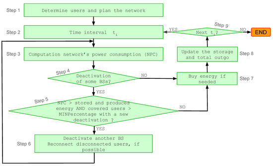 - Only Microcell BSs: Deactivation of some BSs: A part of the microcell base stations is turned off gradually in the event of an energy shortage. The energy consumption of the access network is computed when switching off 1, 2, 3,…,N microcell base stations. As soon as the network’s energy consumption becomes lower than the amount of available renewable energy (stored and produced energy), the necessary number of microcell base stations to be turned off is known.Since the power consumption of a microcell base station is low, many of them should be switched off. In this way, the capacity of the network can be compromised. For this reason, base stations can be deactivated until a minimum percentage of users is covered. The solution is tested with 95% and 90% guaranteed user coverage (Step 5 in Figure 7). All the users connected to the switched microcell base stations are reconnected, if possible (Step 6 in Figure 7). If the available energy continues to be insufficient for the base stations’ supply, the missing part is bought from the traditional power grid (Step 7 in Figure 7). The necessary energy cost and the energy storage are updated (Step 8 in Figure 7).The strategy can be combined with the time window TW: when an energy shortage is detected in a time slot belonging to the time window period, the necessary microcell base stations are deactivated.