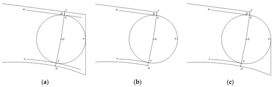 The DU97-Flatback airfoil inherently displays the necessary shape characteristics of blunt trailing edge that just meet the requirement of CC implementation if an appropriate local modification is made to create a highly curved smooth Coanda surface at the trailing edge. In the present study, the Coanda surface is designed to be a circular shape. Figure 2 shows the sketch map of the trailing edge Coanda surface design. The procedure is given as follows: (1) Copy the upper and lower surface profile lines, and translate them inward by a distance of 0.5% chord, forming lines m and n; (2) Construct a circle with the constraint that the circle is tangent to the upper and lower translated lines m and n, as well as the trailing edge line, forming three tangency points E, F and P; (3) Connect the center point O of the circle to the two tangency points E and F, respectively, and then extend the two line segments OE and OF to intersect with the upper and lower profile lines, obtaining two intersection points C and D; (4) For traditional circulation control, the whole part of the circular surface EPF is treated as the Coanda surface [21,25,26,27], as shown in Figure 2b. This traditional CC approach is denoted as full circulation control (FCC) in the present study, in order to distinguish it from the newly proposed partial circulation control (PCC) shown in Figure 2c. In PCC, only the circular surface EP is used as the Coanda surface, which is a less-than-a-half part of the Coanda surface in FCC. Therefore, the naming convention for the three airfoils involved in this study is as follows. The baseline blunt trailing edge airfoil is DU97-Flatback. The modified blunt trailing edge airfoil with traditional CC is denoted as DU97-Flatback-FCC. The modified blunt trailing edge airfoil with the present newly proposed CC is denoted as DU97-Flatback-PCC; (5) The Coanda jet slot is designed at the segment EH with a width of 0.2% chord. To make the jet simulation more realistic, a high-pressure cavity is designed, as shown in Figure 1. The lower surface of the cavity shares a part of the circular surface EF, ensuring that the jet at the slot EH is tangent to the Coanda surface.