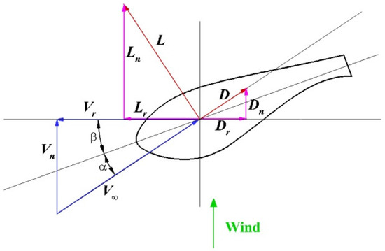 Figure 4 depicts the relative orientation of lift and drag to the rotation plane with respect to the relative wind V∞, where α is effective angle of attack, β is the twist angle at a given radial station. The power coefficient generated by a two-dimensional airfoil with unit span is computed by: