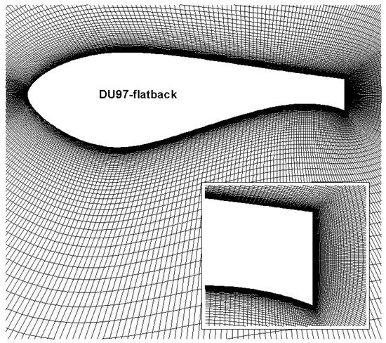 For the DU97-Flatback airfoil, only a few experimental data for CFD code validation can be found in the literature. Barone et al. [22] provided the measured aerodynamic coefficients for a DU97-Flatback airfoil at only three angles of attack (AoA), and all of them are chosen for the present CFD code validation. According to the experimental setup, the present validation conditions are set as AoA = 4.12°, 11.05°, 13.40°, respectively, with the same Ma = 0.168 and Re = 3.0 × 106. The results of lift, drag and moment coefficients are given in Table 2, Table 3 and Table 4. The calculated lift coefficients agree rather well with the experiment, while the drag and moment coefficients have a little larger discrepancies with the experimental data but within an acceptable extent. The discrepancy between the calculated and experimental drag coefficients might be due to several aspects, including the limitation of the RANS turbulence model, lack of transition prediction, uncertainty of the experiment which is subject to error, unsteadiness and wind tunnel wall interference, etc. The moment coefficients are calculated from the corresponding lift and drag coefficients, and hence there is no surprising that they have some discrepancies with the experiment. In Table 2, Table 3 and Table 4, it is shown that the lift, drag and momentum coefficients all decrease a little with increasing grid number. Looked from the overall, the relative changes between two successive grids are quite small, and the maximum is 5.26% which corresponds to CD comparison between the coarse grid and medium grid A at AoA = 11.05°. The maximum relative change is 2.6% between the medium grids A and B, and 1.8% between the medium grid B and fine grid. Therefore, the maximum relative change between the medium grid B and fine grid is the smallest. The relative percentage of variation of 1.8% is acceptable for the present grid independency study, and hence the present study adopts the medium grid B as the result of the grid independency study for DU97-Flatback. The medium grid B is shown in Figure 5 with a close-up of the trailing edge, and it is demonstrated that it’s satisfactory for the present RANS simulation. The computational grids for CC airfoils will be generated based on the scale of the current medium grid B.