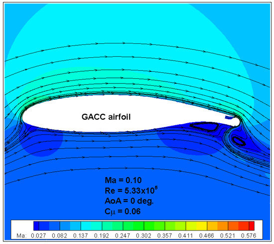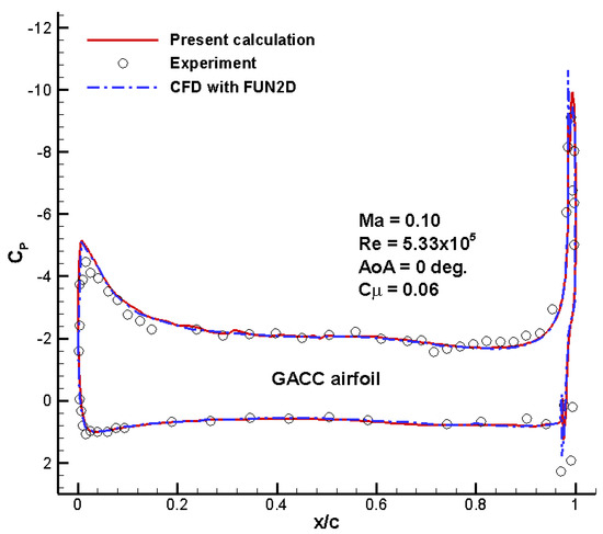 An experimental airfoil General Aviation Circulation Control (GACC) which is analogous to the present FCC configuration is chosen to conduct the present CFD validation for CC implementation, since there is no test data available for the present proposed CC wind turbine airfoils. The GACC airfoil was developed in a test program intended to address some technology issues associated with CC implementation in the aeronautical application [25]. It is a supercritical airfoil model with dual slotted circulation control capability for low speed testing in the LaRC Basic Aerodynamic Research Tunnel. According to the test setup and test data available, the validation condition is set as AoA = 0°, Ma = 0.10, Re = 5.33 × 105, Cμ = 0.06. The pressure coefficient distribution is calculated and shown in Figure 6, and the experimental data and CFD result by Jones et al. [25] using the FUN2D code are shown for comparison. The FUN2D code employed the same RANS equations in conservation-law form along with the Spalart-Allmaras turbulence model as the present solver, except that the grid is fully unstructured. Hence, as expected, the present result agrees very well with that from FUN2D, nearly coincident with each other. There is a favorable comparison of the CFD and experimental pressure coefficient distributions. The CFD results agree very well with the experiment over almost the entire airfoil surface except the bottom trailing edge area where the local measured pressure coefficient even exceeds 2.0. This discrepancy may be due to the lack of confidence in the experimental trailing edge pressure data and the associated error magnitudes, as indicated in Jones et al. [25]. The flow field with streamlines and Mach number contour is given in Figure 7, showing that the free stream is deflected significantly due to the Coanda effect at the trailing edge. This validation demonstrates that the present solver is reliable and adequate for the circulation control simulations.