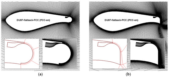 In this subsection, five different airfoils are involved, including the DU97-Flatback, DU97-Flatback-FCC, DU97-Flatback-FCC_jet-off, DU97-Flatback-PCC, DU97-Flatback-PCC_jet-off. In the following text, the last four will be referred for short as FCC-on, FCC-off, PCC-on, PCC-off, respectively. The FCC-off and PCC-off airfoils are identical to the corresponding FCC-on and PCC-on airfoils, respectively, if the high-pressure cavity is disregarded and removed in simulations when the Coanda jet is switched off. Therefore, only two grids are needed to generate, namely, a grid for FCC-on and a grid for PCC-on. The grids for FCC-off and PCC-off can be obtained by directly removing the grid in the cavity of FCC-on and PCC-on, respectively.