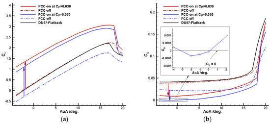 Four observations can be obtained from the comparison of lift coefficients in Figure 9a. (1) PCC-off has the ability to maintain the lift level of the baseline DU97-Flatback, and even provide slight enhancement in lift characteristics at some AoAs. The lift coefficient is increased a little for AoAs below 10°, and the stall is delayed by about 1°. For AoAs = 10~16°, the lift coefficient line almost coincides with that of the baseline DU97-Flatback. That is to say, the PCC modification to the trailing edge can avoid any degradation in lift characteristics compared with the baseline flatback airfoil. This is a very important advantage of the newly proposed PCC design; (2) FCC-off generates significant reduced lift while remains almost unchanged stall AoA. At the typical working AoA = 15°, the lift coefficients of FCC-off and the baseline DU97-Flatback are 1.71 and 2.12, respectively. The FCC-off design causes a decrement as high as 0.41, which is detrimental to the wind turbine performance once the Coanda jet is turned off; (3) Both the PCC-on and FCC-on with Cμ = 0.030 significantly enhance the lift coefficients and increase the stall AoA a little by about 1°, compared with the baseline DU97-Flatback. Moreover, PCC-on generates a much higher lift coefficient than FCC-on over the entire range of AoAs, which is another advantage of the present PCC design. At the typical working AoA = 15°, the lift coefficient of PCC-on reaches 3.02, while that of FCC-on is 2.89. This increment of 0.13 in lift coefficient is significant in amount in flow control; (4) It is interesting to note that the increment in lift coefficient between the jet-off and jet-on cases of FCC is larger than that of PCC, although PCC outperforms FCC in terms of total lift characteristics in both jet-off and jet-on situations. As indicated with the arrows in Figure 9a, at AoA = −2°, the increments of PCC and FCC are 1.277 and 1.394, respectively, and FCC’s is 0.117 larger than PCC’s. This phenomenon exists over the entire range of AoAs, especially at higher AoAs, indicating that the lift-enhancement efficiency in terms of lift increment between jet-on and jet-off is better for FCC, compared with PCC. This might be one reason that the FCC design is in common use in aeronautical CC applications. This study finds that this may be misleading. The lift characteristics in terms of ultimate total value rather than just increment between jet-on and jet-off cases should be the most concerned aspect in practice. The larger increment of FCC is offset by its much lower jet-off lift coefficient value, resulting in a much lower total lift coefficient value than that of PCC. Therefore, PCC is better than FCC in terms of lift characteristics. It is noted that both PCC-on and FCC-on cause severe and abrupt stall, and only slightly favorable control are achieved, since the lift coefficients after stall are a little higher than the baseline DU97-Flatback, and the drag coefficients after stall are a little lower than the baseline DU97-Flatback. Hence, this stall behavior indicates that the present CC technique is effective only for the attached flow regime.