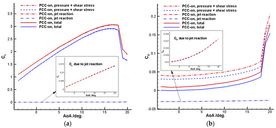 Decomposition of the force coefficients for PCC-on and FCC-on: (a) Lift coefficient; (b) Drag coefficient.