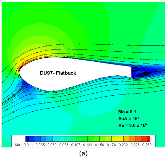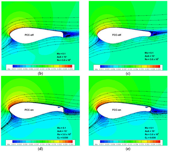 The flow fields of the five airfoils at the same AoA = 15° with streamlines and Mach number contours on the same scale are given in Figure 11. Comparing the first three cases without jets, the baseline DU97-Flatback has the largest counter rotating wake vortex pair due to the bluntest trailing edge, thus producing the largest base drag. In addition, the comparison of streamline patterns near the bottom trailing edges in Figure 11a–c can intuitively indicates the difference in lift. The streamlines near the bottom trailing edge of the baseline DU97-Flatback and PCC-off are both forced to bend more downward than FCC-off, due to the presence of the sharp and downward-oriented corner. The circular shape of the bottom trailing edge after the FCC modification results in a significant change to the effective camber as well as the trailing edge Kutta condition. The streamlines near the bottom trailing edge of FCC-off will not bend downward as much as the PCC-off or the baseline DU97-Flatback. Therefore, FCC-off suffers a significant degradation in lift performance, while PCC-off holds the same lift level as the baseline DU97-Flatback, as shown in Figure 9a. For the two cases with Coanda jets activated shown in Figure 11d,e, the streamlines bend downward significantly due to the entrainment of jets. From the discussion on circulation around a lifting circular cylinder in the classic aerodynamics textbook by Anderson [41], a larger circulation is accompanied by a larger deflection of free stream direction and a more downstream leading edge stagnation point. Therefore, in this sense, the Coanda jets in Figure 11d,e drastically increase the circulation and hence the lift. To compare the deflection degrees of freestream streamlines in an intuitive way, the views in Figure 11 are all displayed in the same scale when plotting these flow fields, and the streamlines through the respective leading edge stagnation points are given. It can be seen that the streamlines of PCC-on bend downward the most, and the streamline deflection degree of FCC-on is weaker than but very close to that of PCC-on, which will be further illustrated in Figure 12 by comparing the pressure distributions.