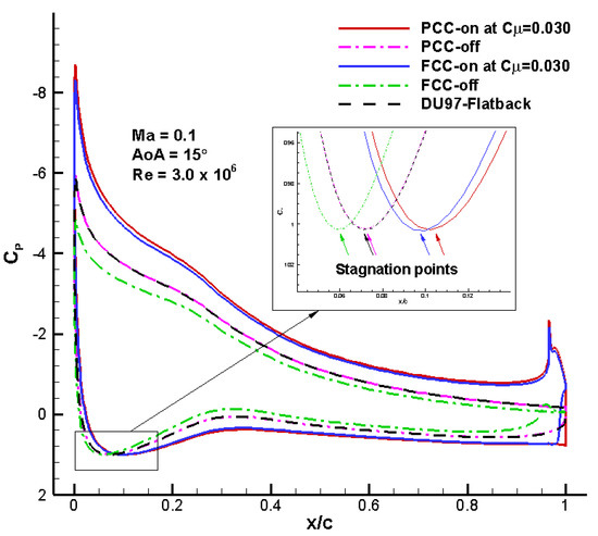 Figure 12 shows the pressure distributions of all the above five cases at the same AoA = 15° with an enlarged window indicating the locations of leading edge stagnation points. Comparing PCC-on and FCC-on, we can find that the enclosed area of PCC-on is a little larger than that of FCC-on, and the leading edge suction surface and bottom trailing edge surface contribute the most to the surplus area. The pressure distribution of PCC-off is almost coincident with that of the baseline DU97-Flatback. The enclosed area of FCC-off is significantly reduced, compared with DU97-Flatback. It is obviously noted that the FCC-off modification to the trailing edge causes significant loss of the suction on the upper surface and pressure on the bottom trailing edge area. The locations of stagnation points shown in the close-up window reflect the difference between the enclosed areas and hence lifts. The larger the enclosed area, the higher the lift generated, and the more downstream the leading edge stagnation point will move. PCC-off has a slightly more downstream stagnation point than the baseline DU97-Flatback (although seemingly coincident), indicating a slightly higher lift coefficient. PCC-on has the most downstream stagnation point since it has the highest lift coefficient. Therefore, from the pressure distribution analysis, it is further demonstrated that the PCC design is a better choice to implement CC on the flatback airfoil.