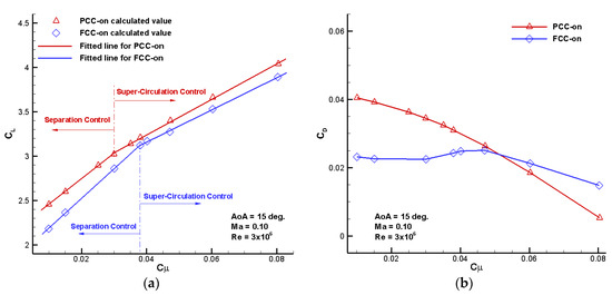Fifteen more cases for the PCC-on and FCC-on configurations with a range of Cμ from 0.010 to 0.080 are simulated under the same conditions: Ma = 0.10, Re = 3.0 × 106, AoA = 15°. The computed lift and drag coefficients are plotted versus Cμ in Figure 13. The discrete points of the computed lift coefficients for PCC-on and FCC-on are fitted with piecewise straight lines, respectively, to better display the variation law versus Cμ. It is found that the common feature of PCC-on and FCC-on is that the lift coefficient varies linearly with increasing Cμ with a fixed slope till a certain transition Cμ, and then continues to increase with increasing Cμ but with a lower fixed slope till beyond Cμ = 0.080. Indeed, this feature is consistent with the previous finding in the circulation control research by the aeronautical community [44] and in the previous work at a much lower AoA [21]. In general, circulation control experiences two typical regimes as Cμ increases, which are defined as separation control and super-circulation control [44], as illustrated in Figure 13a. The two regimes are characterized by different global lift-enhancement efficiencies which can be reflected by the slope of the lift coefficient curve versus Cμ. All the previous findings showed that the lift-enhancement efficiency in the separation control regime is higher than the super-circulation control regime. The present results also demonstrate that PCC-on and FCC-on at the present specific condition both exhibit the same global feature. However, there are also some significant differences between PCC-on and FCC-on, such as the lift coefficient level, the value of transition Cμ and the slope of each regime. The lift coefficient of PCC-on is much higher than that of FCC-on over the entire investigated Cμ, demonstrating the superiority of PCC-on over FCC-on. The transition Cμ of PCC-on is about 0.030, while the transition Cμ of FCC-on is delayed to about 0.038, indicating that PCC-on will enter super-circulation control earlier than FCC-on. Regarding the slope, FCC-on has a higher slope in the separation control regime, while PCC-on has a slightly higher slope in the super-circulation control regime; namely, the lift-enhancement efficiency of PCC-on is lower in the separation regime, but higher in the super-circulation regime. For the drag coefficient shown in Figure 13b, PCC-on and FCC-on have different variation trend with increasing Cμ. The CD of PCC-on decreases monotonically with increasing Cμ, and the average slope in the separation control regime is lower than that in the super-circulation control regime. The CD of FCC-on first decreases to a minimum at about Cμ = 0.030, and then increases to a maximum at about Cμ = 0.047, and then decreases again nearly linearly with a much lower slope than PCC-on. Overall, the drag variation of PCC-on is much more drastic than that of FCC-on.