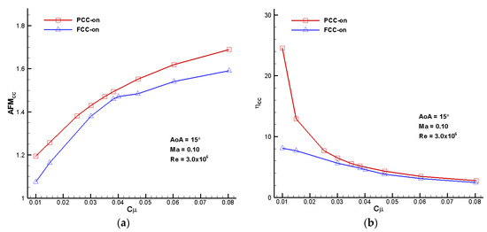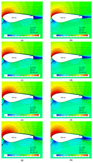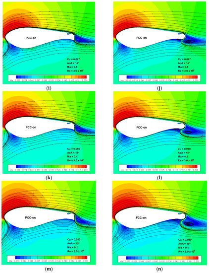 Figure 14 shows the flow fields of both PCC-on and FCC-on at different Cμ levels with streamlines and Mach number contours. The plotted views as well as Mach number legends of all figures are in the same scale, respectively, in order to make comparison easier and more intuitive. Comparing the contours of different configurations at the same Cμ, we can easily see that the flow speed of PCC-on at the leading edge suction area is higher than that of FCC-on. Taking Cμ = 0.010 for example, the range of the same legend red color in Figure 14a near the leading edge is obviously larger than that in Figure 14b, indicating that a stronger suction is generated for PCC-on. Similarly, comparing the contours of the same configuration at different Cμ, we can also easily see the difference in lift generated. Taking PCC-on at the lowest Cμ = 0.010 and the highest Cμ = 0.080 for example, the red color area in Figure 14m is much larger than that in Figure 14a, indicating that the lift generated at Cμ = 0.080 is much higher than that at Cμ = 0.010. The comparison can also be performed using the deflection of the freestream streamlines.