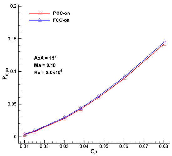 The power consumed by the pump to generate the Coanda jet is given in Figure 15. The power coefficient of PCC-on is very close to but slightly lower than that of FCC-on over the entire range of jet momentum coefficients. The discrepancy seems to increase gradually with increasing Cμ, although it is still very small in value. This observation can be explained by comparing the flow fields shown in Figure 14. From the above analysis, the base drag of PCC-off is larger than that of FCC-off, as shown in the drag coefficient comparison in Figure 9b as well as in the flow field comparison in Figure 11b,c. A higher base drag indicates a lower base pressure due to the separation vortices. Hence, the pressure behind the trailing edge of PCC-off is lower than that of FCC-off. It is a common sense that it will feel easier for the pump to drive the jet flow to a lower pressure area, and hence save power expenditure. Therefore, once the Coanda jet is activated with a same momentum coefficient, the power coefficient of PCC-on will be a little lower than that of FCC-on. Regarding the increasing variation trend of the difference, there is more explanation. Looking at the jet plumes of PCC-on and FCC-on in Figure 14, especially at larger jet momentum coefficients, we can find that the injection directions of the jet into the main flow in PCC-on cases are always perpendicular to the chord line, whereas the jet in FCC-on cases will flow upstream for some distance before it is forced to deflect downstream by the main flow. In the present specific study, the angle between the jet plume direction and local main flow near the bottom trailing edge is an acute angle for PCC-on, but a larger obtuse angle for FCC-on. The influence of the main flow to the jet injection is obviously weaker in PCC-on cases than in FCC-on cases. Therefore, the jet of FCC-on needs to resist more head wind than PCC-on, thus consuming more power. Moreover, the obtuse angle for FCC-on becomes even larger when Cμ increases, while the acute angle for PCC-on remains unchanged. This is why the difference in power coefficient grows with increasing Cμ.